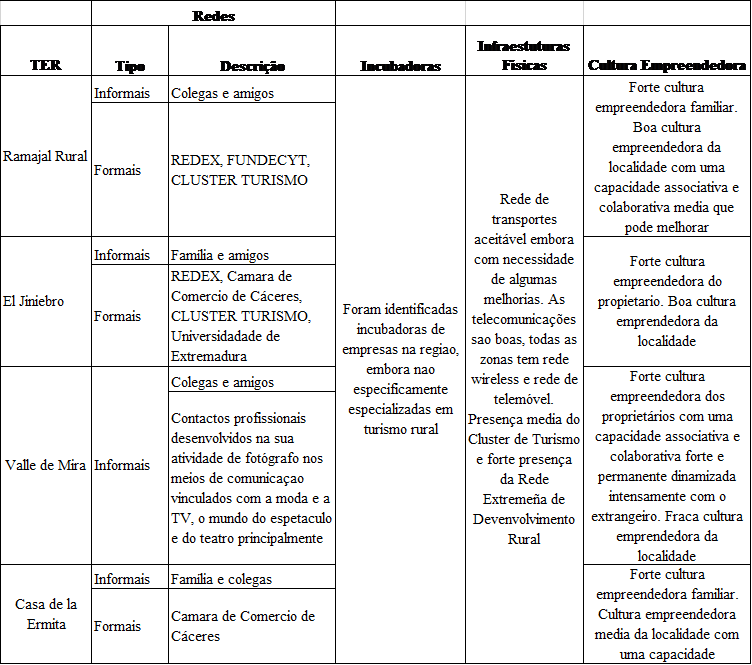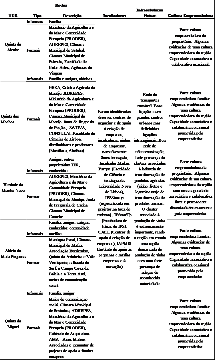 De um modo geral, em todos os casos e regiões estudados, a existência de redes informais revelou-se muito importante na criação e desenvolvimento da atividade empreendedora TER, tendo, de um modo geral, todos os empreendedores se referido a esse tipo de redes como crucial na mobilização de recursos não econômicos, nomeadamente em termos de obtenção de motivação, de apoio, na partilha de recursos (infraestruturas, equipamentos, entre outros), na participação ativa dos projetos e no aumento de novos contatos, que se mostraram cruciais para o desenvolvimento dos projetos. A rede informal é também particularmente importante, nos casos brasileiros, na mobilização de recursos econômicos.