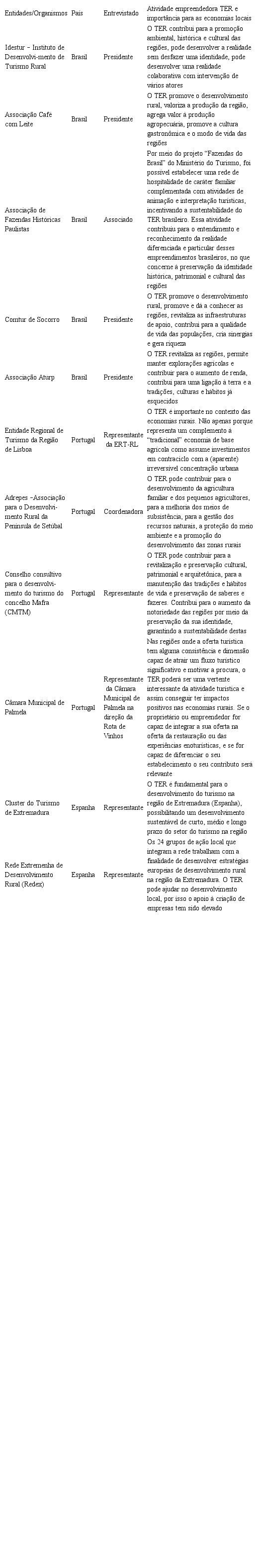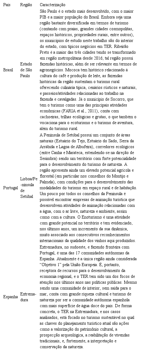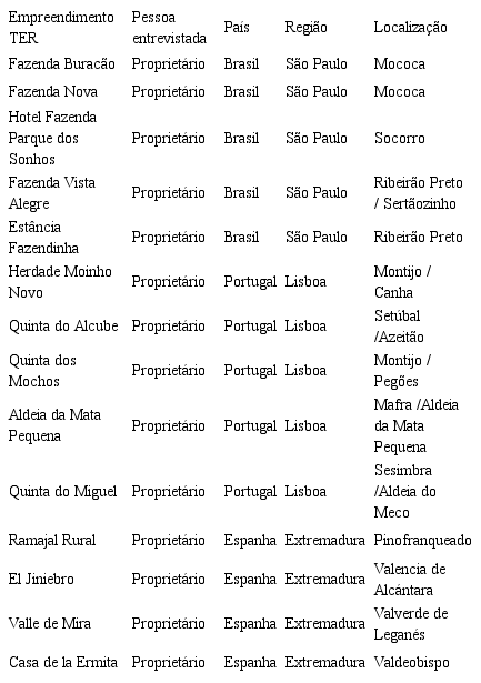 As entrevistas realizadas com um conjunto de organismos ligados ao TER no Brasil, em Portugal e na Espanha permitiram confirmar a importância dessa atividade para as economias locais, que depende muito da capacidade dos empreendedores e dos recursos que estes detêm e conseguem mobilizar (Quadro 3).