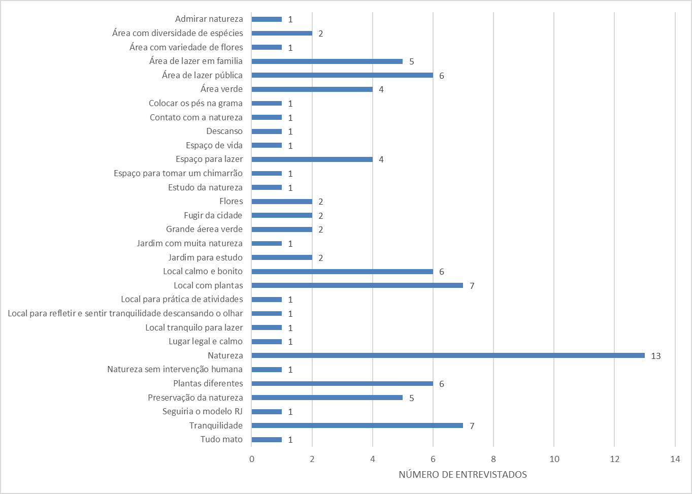 Há, muito forte, a ideia ou mesmo idealização dos dois Jardins Botânicos, expressas em afirmações como: “reserva natural no meio da cidade”; “um lugar reservado no meio da natureza”; “parque para contato com a natureza”; “um oásis no meio da cidade” que permitiria “uma fuga do cotidiano” e o “contato com a natureza”. Esse oásis e local de fuga do cotidiano marcar-se-ia pela “tranquilidade”, “ar puro”, “centro de natureza, lugar de descanso”, sendo um “lugar bonito, de beleza natural, com paz, tranquilidade”, permitindo “relaxar” ou mesmo “relaxar, tomar chimarrão”. Esse “parque legal” seria um “local para ver a natureza na região metropolitana” e um “espaço bonito, que possibilita contato com a natureza, difícil na cidade”. Assim, coloca-se também como um “espaço de lazer e estudo”, um “lugar lindo para fotografar”, favorecendo “questão de saúde e contato com a natureza”, mas sem esquecer que “além de local de lazer, é um centro de pesquisa”, com a vantagem de ter “acesso gratuito, com custo baixo e boas instalações”. Os entrevistados em Caxias do Sul, que demonstram a ausência de consciência sobre o perfil científico, de pesquisa e preservação da área, em suas respostas, relacionam o Jardim Botânico com as palavras “natureza” e “flores”, descrevendo a área como um “local tranquilo” para “atividades de lazer”. Apenas 18% da amostra menciona a “diversidade de espécies” para “estudo” e “preservação da natureza”. Esse “jardim de estudos” é apontado por essa minoria como um “local para refletir” e “descansar o olhar” da agitação da cidade.