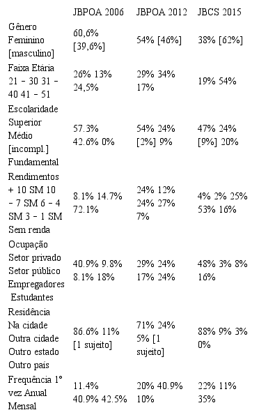 Os resultados porto-alegrenses, por surgirem em momentos diferenciados, permitiram avaliar, também, tendências. A pesquisa de 2012 indica uma leve predominância das mulheres [54%] no universo pesquisado, em especial nos domingos à tarde, reduzindo percentuais de 2006 [60,6%], ou seja, indica como tendência o maior equilíbrio entre ambos os sexos. A faixa etária predominante foi a dos 21 aos 40 anos [63%], mas que em 2006 significava 39%, de modo geral, indicando um rejuvenescimento da frequência. Em termos de nível de escolaridade, houve uma maioria [54%] dos sujeitos com curso superior completo ou em desenvolvimento, tendo o ensino médio completo alcançado 24% e o incompleto apenas 9%. Em 2006, o índice para terceiro grau [57,3%] e com ensino médio completo [42,6%] alcançava 100% da amostra. Como tendência, indica-se uma diversificação no que se refere ao nível de escolaridade dos visitantes, com a atração de um público com relativa menor escolaridade, em anos recentes. Em Caxias do Sul, os resultados apontam a predominância do sexo masculino [62%], dado que pode estar associado à prática da pesca, que é autorizada na represa ali localizada, em especial durante a semana. Nos finais de semana alteram-se as atividades desenvolvidas na área, havendo, da mesma forma, alteração no perfil de frequentadores, que passa a incluir grupos familiares. Com relação à distribuição etária, predomina a faixa entre 21 e 42 anos [75%], como em Porto Alegre. A incidência de pessoas com escolaridade superior e média [71%], não fica muito distante do encontrado na capital.