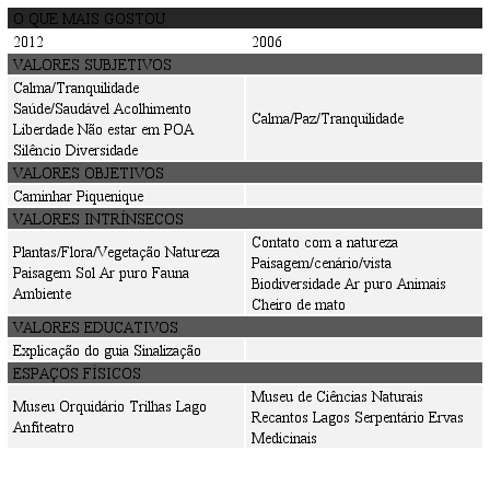 Na avaliação do paisagismo, o ótimo [59%] e o bom [27%] predominam em Porto Alegre, mas aparecem o regular [10%] e o ruim [2%]. Em 2006, ótimo e bom somavam 99,9%. A tendência, portanto, também indica queda do ótimo de 80,3% para os 59%, parte da diferença indo alimentar o bom, que de 19,6% passa para 27%, mas também o regular e até o ruim. Em Caxias do Sul, a percepção sobre o paisagismo assinalou o ótimo [43%], enquanto 36% das pessoas ouvidas avaliam como regular a sinalização encontrada no Jardim Botânico. Quando questionados sobre algum evento realizado no Jardim de Porto Alegre, 94% do público relatou desconhecer qualquer tipo de divulgação sobre tal. Sobre as preferências em relação à área, houve destaques para as palavras “Calma”, “Natureza”, “Paisagem”, “Lagos” e “Fauna”, predominando o que estamos denominando como valores intrínsecos (ver Quadro 2). Como espaço favorito, destaque para os “Lagos” e “banhados”, “trajetos” (trilhas) e “gramados”, ou seja, predominam os espaços físicos em Porto Alegre, talvez induzido pela formulação da pergunta.