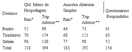 O universo de estudo é composto pelas empresas de três destinos turísticos nacionais: Itatiaia (RJ), Bonito (MS) e Tiradentes (MG). Esses destinos foram selecionados em função do alto desempenho da economia do turismo e da importância do turismo para a economia local. O Ministério do Turismo (2015) categorizou os 3.345 municípios inseridos no Mapa da Regionalização de acordo com o desempenho na economia do turismo, sendo que Itatiaia, Bonito e Tiradentes ficaram no segundo grupo de melhor desempenho (estando entre os 5,5% destinos turísticos nacionais de melhor desempenho).