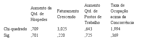 O resultado do Teste de Kruskal Wallis (Tabela 2), que compara a média das variáveis de desempenho das empresas dos três destinos, indica que não há diferenças significativas (Sig. > 0,05). Esse resultado corrobora a classificação das três localidades em uma mesma categoria, a partir da análise do desempenho realizada pelo Ministério do Turismo (2015). Destaca-se que as variáveis empregadas no referido estudo analisaram o destino turístico, enquanto que as variáveis ora empregadas tratam da percepção de desempenho.