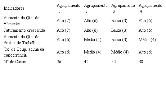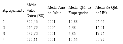A Tabela 4 apresenta as características médias das empresas por Agrupamento para as variáveis: diária, ano de início de funcionamento, quantidade de empregados e quantidade de Unidades Habitacionais (UHs). Não obstante se tratar do melhor desempenho, o Agrupamento 1 apresenta também os maiores valores médios para as variáveis Diária, Quantidade de Empregados e Quantidade de UHs. O Agrupamento 3 apresenta os menores valores para as variáveis Diária e Quantidade de Empregados levando uma discreta vantagem sobre o Agrupamento 2 na Quantidade de UHs. Os Agrupamentos 2 e 4, embora apresentem desempenhos similares, são bastante diferentes no tocante às variáveis Diária Média, Quantidade de Empregados e Quantidade de Quartos. A variável Ano de Início de funcionamento do estabelecimento apresentou valores similares para os quatro agrupamentos.