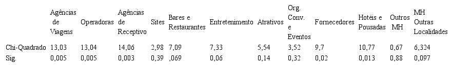 Pode-se observar na Tabela 5 que, dos 12 relacionamentos apresentados, sete não apresentaram resultados estatisticamente significativos (Sig. >0,05): Sites de Oferta de Hospedagem; Bares e Restaurantes; Empresas de Entretenimento e de Diversão; Atrativos Turísticos; Empresas Organizadoras de Convenções e Eventos; Relacionamentos com Outros Tipos de Meios de Hospedagem; e Meios de Hospedagem de Outras Localidades. A diferença nas médias dessas variáveis nos agrupamentos analisados não foi estatisticamente significativa. Esse resultado permite inferir que esses relacionamentos não influenciam o desempenho superior das empresas analisadas. A ausência de influência sobre o desempenho pode ser explicada por dois motivos. Ou os relacionamentos não são efetivamente relevantes para o desempenho das empresas, ou, de forma alternativa, esses relacionamentos são relevantes, contudo, ocorrem de forma idêntica para todas as empresas em um mesmo destino, não sendo um diferencial para alcançar um desempenho superior, conforme os argumentos de Barney (1991).
