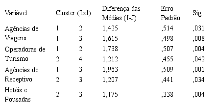 Conforme pode ser observado na Tabela 5, relacionamentos com Agências de Viagens, Operadoras de Turismo, Agências de Receptivo, Fornecedores e com Hotéis e Pousadas apresentaram resultados significativos (Sig. <0,05), indicando a presença de diferenças estatisticamente significativas na ocorrência desses relacionamentos para os diferentes agrupamentos de empresas. O Teste de Kruskal Wallis, no entanto, não permite identificar entre quais grupos ocorreu a diferença (se entre todos os grupos ou se entre um par de grupos específicos). Para analisar as diferenças entre pares de grupos, foi aplicado o Teste de Tukey, um procedimento post hoc empregado para contrastar e identificar diferenças entre pares de grupos (Malhotra, 2012). Os resultados significativos (Sig. <0,05) são apresentados na Tabela 6.
