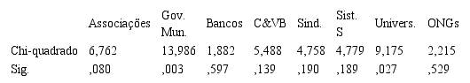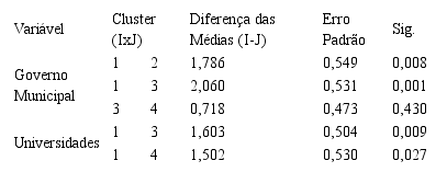 Seguindo os procedimentos empregados para análise das relações com as empresas da cadeia produtiva do turismo, o Teste de Kruskal Wallis foi utilizado para identificar entre os diferentes agrupamentos a ocorrência de diferenças significativas no padrão de relacionamentos estabelecido, sendo posteriormente empregado o Teste de Tukey para contrastar e identificar diferenças entre pares de Agrupamentos. Os resultados (Tabelas 7 e 8) encontrados indicam diferenças nos relacionamentos com o Governo Municipal e com Universidades.