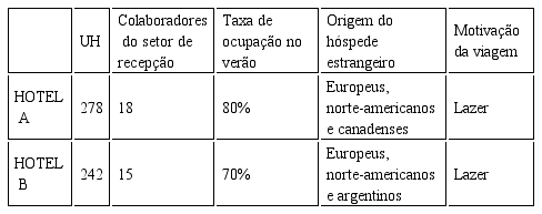 De acordo com o Quadro 1, os hotéis estudados apresentam aproximadamente o mesmo número de UH – diferença de apenas 36 apartamentos – e praticamente o mesmo número de colaboradores no setor de recepção em proporção ao número de UH. Os hóspedes estrangeiros, provenientes dos continentes europeu e norte-americano e da Argentina, buscam os hotéis para lazer e são responsáveis por 70% (Hotel B) a 80% (Hotel A) da taxa de ocupação durante a alta temporada.