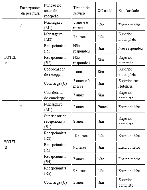 Além disso, verifica-se que, entre os que responderam sobre o nível de escolaridade, no Hotel A, a maioria dos participantes está cursando nível superior, mas não na área de hotelaria. Por outro lado, os dados obtidos do Hotel B mostram que a maioria dos participantes, com exceção do supervisor de recepção e do concierge, estudou somente até o Ensino Médio. Tais dados indicam que os colaboradores não têm formação profissional específica em hotelaria, salvo o concierge do Hotel A, e apenas oito dos 14 participantes têm competência na língua inglesa, o que corrobora os achados do estudo de Silva e Bonifácio (2015).