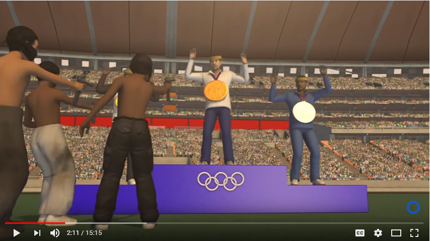 Os problemas de saúde gerados por uma superbactéria mortal e os “bebês zika” relacionam-se também com o medo que é imputado em relação à violência na cidade. Homens negros encapuzados, algumas vezes sem camisa e com calças rotas (pobres), aparecem armados ameaçando turistas (gordos e brancos) e atletas. Roubam dinheiro, celulares, medalhas, matam pessoas desarmadas que não reagem, perseguem – ratificando a ideia de que os discursos sobre medo e violência frequentemente estão ligados ao crime violento e também a questões raciais e preconceitos de classe. Uma das matérias cita o jogador de futebol Rivaldo, o qual sugeriu publicamente que os turistas não viessem ao Rio pelo perigo de morte[12]. A violência também aparece na matéria que aborda pedaços de corpos encontrados em Copacabana, em local próximo à arena de vôlei de praia. Imagens de uma perna são exibidas, enquanto o narrador diz que as partes do corpo não foram retiradas porque policiais não estão recebendo salário. Também fazem “piada” em relação ao mau cheiro durante os jogos, por causa do calor (relacionando, mais uma vez, ao nojo e aos problemas nas instituições públicas).