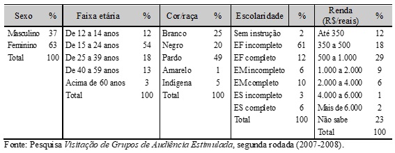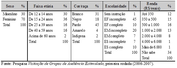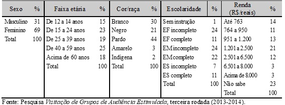 Observam-se que as mulheres foram a maioria (70%) do público presente no primeiro ano da pesquisa e que os negros e pardos somam 63% do público total. Além disso, 43% dessa audiência estimulada têm o rendimento mensal de até 1.000 reais, o que reforça o caráter de inclusão social do projeto. É válido lembrar que, quanto à renda domiciliar mensal, 34% não souberam informar porque são bem jovens (30% têm de 12 a 14 anos). Com relação ao perfil etário, 30% estão na faixa de 12 a 14 anos e 36% são jovens de 15 a 24 anos. Quanto ao nível de escolaridade, 45% dos participantes desta rodada da Visest não possuem o ensino fundamental completo. Apenas 10% possuem o ensino superior completo.