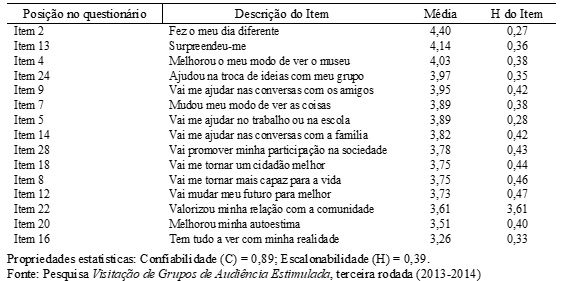 Por outro lado, observam-se que os itens de natureza social (Tabela 5, abaixo) formam um bloco com valores médios em maioria menores que quatro (as respostas oscilam entre concordo e não sei), sugerindo que o público respondente não estabelece uma conexão forte entre as experiências vividas na visita e sua realidade cotidiana. Tal assertiva encontra eco na média alcançada pelo item 16 "Tem tudo a ver com minha realidade" (3,26 – menor média).