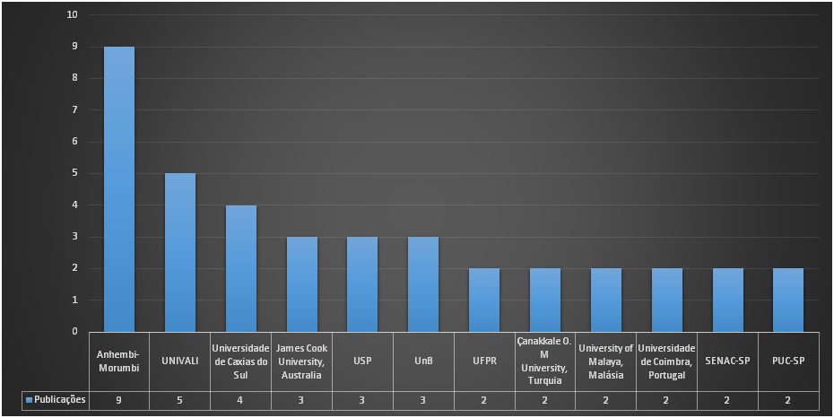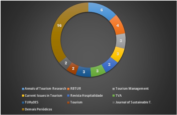 Os periódicos de maior contribuição são Annals of Tourism Research com 6 trabalhos, RBTUR com 4, e Tourism Management, C.I.T, Revista Hospitalidade, Turismo – Visão e Ação e TURyDES com 3 cada (Figura 4). O periódico Annals of Tourism Research (ISSN 01607383) é considerado, dentro do meio acadêmico, como um dos mais bem-conceituados do turismo mundial. Possui um Journal Impact Factor/JCR – ISI de 2.685 (o mais alto de todos os periódicos do turismo mundial), um H (Index) Scopus de 95 e um conceito Qualis (2013-2014) A1 (UNIVERSIDADE DO VALE DO ITAJAÍ, 2015). Conta com no mínimo o dobro de publicações de praticamente todas as demais organizações, mostrando a importância desse tema para o turismo mundial e como publicações sobre os hostels podem possuir um impacto significativo no meio acadêmico.
