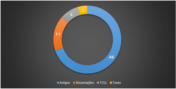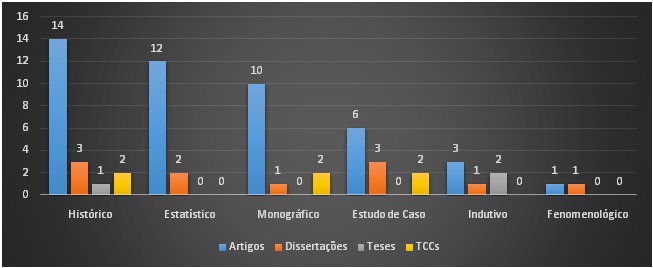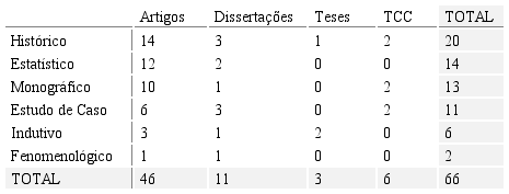 O método monográfico/bibliográfico aparece como terceira opção, possivelmente pelo fato de poder facilitar a pesquisa acadêmica, principalmente a de graduação, realizada dentro de salas de aula/pesquisa, minimizando saídas de campo. Em uma análise puramente quantitativa percebe-se a clara predominância dos artigos científicos e do método histórico sobre as demais formas de produção acadêmica (Tabela 1).