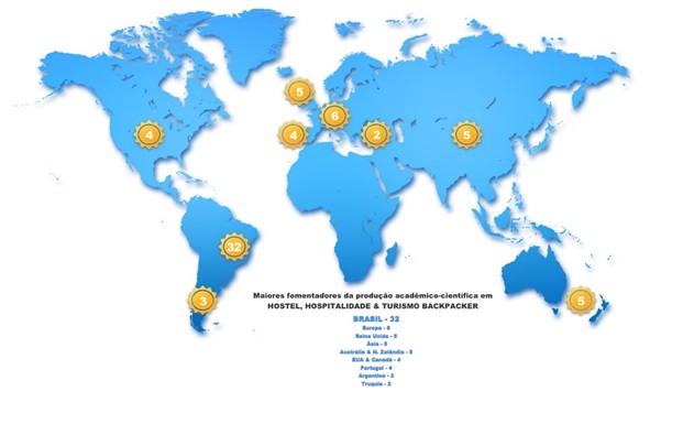 O Brasil rendeu um número significativamente maior que os demais países, pois é o local da pesquisa onde foi feita uma varredura mais profunda. Percebe-se que o maior centro de pesquisa é o continente europeu, devido à sua tradição alberguista. Outro local significativo é a Austrália com cinco (5) trabalhos (Figura 6).