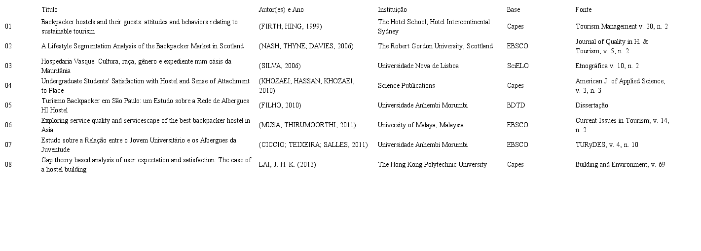 De todos os resultados provenientes dessa pesquisa, nenhum aborda como tema principal a conceptualização dos hostels. Com exceção dos livros de Giaretta (2003) e Trotta (1978), não há outra publicação do gênero que analise a história desse meio de hospedagem, no Brasil, a fim de compreender seu papel no turismo atual. Com exceção de Bahls (2015), nenhum profundo esforço acadêmico foi feito, até o momento, para saber quais são suas características singulares que os diferenciam dos demais meios de hospedagem tradicionais.
