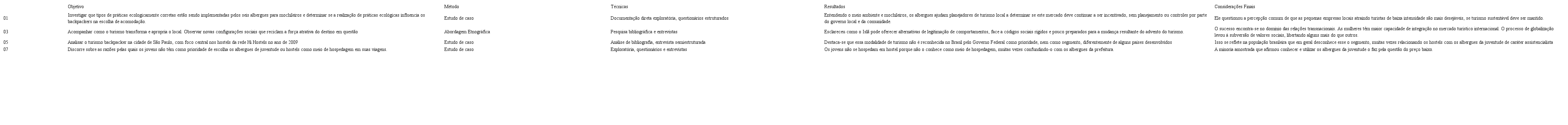 Apesar dos dados apresentados acima, as informações mais relevantes sobre esses estudos são, na verdade, seus objetivos, resultados e considerações finais. Esses conteúdos são os mais variados, alguns com temas extremamente pertinentes ao abordado por este estudo. Outros, com caráter multidisciplinar, mostram que podem ser úteis como revisão teórica. Em uma análise puramente quantitativa, esses trabalhos perderiam seu contexto e significado. Portanto, a título de ilustração e de síntese, criou-se uma tabela que reúne oito trabalhos considerados relevantes para auxiliar a compor um quadro teórico do tema de estudo neste momento. Desses trabalhos, quatro merecem destaque (Tabelas 2 e 3).