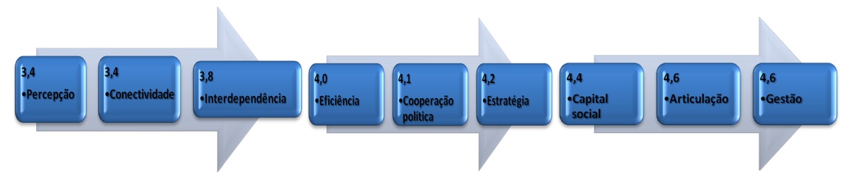 Observa-se que na visão dos respondentes, as variáveis que tiveram maior densidade no número de respostas foram: capital social e interdependência obtendo 10 respostas cada uma. Mesmo apresentando rankings médios menores e diferentes, 4,4 e 3,8, respectivamente, refletem que essas variáveis possuem maior densidade de opinião, permitindo identificar que os atores percebem que o CVB possui uma rede de relações, confiança, canal de comunicação e que reconhecem que deve haver uma interdependência nos temas de interesse comum. Reforçando o conceito de ambas as variáveis, é fato notório que em uma região, onde há a existência do capital social, torna-se possível a tomada de ações colaborativas que resultem em benefícios para toda a comunidade. A interdependência é um elemento-chave associado ao conceito de governança, pois permite através dessa interação a formação de redes de atores que trocam recursos e informações para alcançar objetivos políticos.