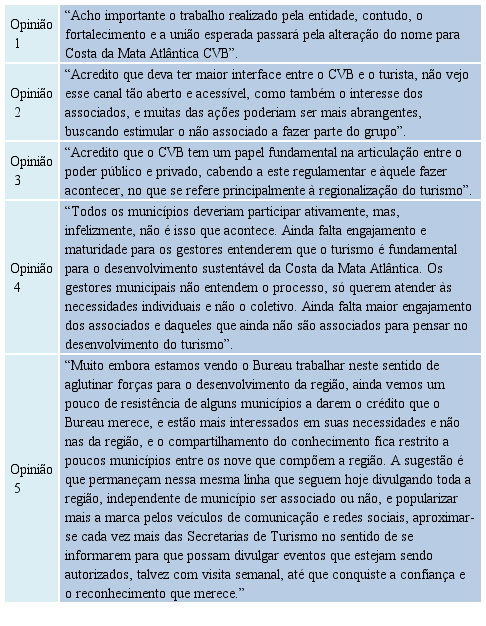Poder-se-ia identificar na opinião dos respondentes que percebem a importância da união para o fortalecimento da região, todavia, ainda não conseguem se articular em rede e cada um está atento somente para seus interesses. Observa-se, também, a importância dada para alteração do nome para Costa da Mata Atlântica, como forma de melhorar o sentimento de pertencimento e aumentar o número de associados de todos os municípios. Todos esses pressupostos refletem a confiança desses atores nas ações desenvolvidas pelo CVB e na participação efetiva para contribuir para o desenvolvimento turístico.