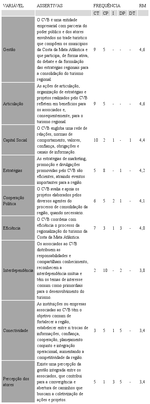 E finalizando com densidade menor, de 5 respostas, estão a conectividade e a percepção dos atores, com os menores ranking médio 3,4, o que explica a falta de união, as ações individualizadas e a baixa participação no CVB, ou seja, essas variáveis refletem a capacidade estrutural de facilitar a comunicação sem ruídos entre seus componentes, fator imprescindível para o fortalecimento da região como destino turístico.