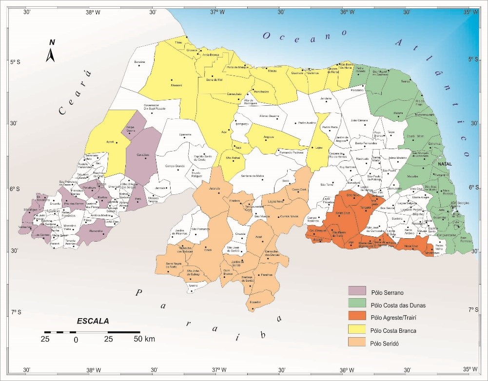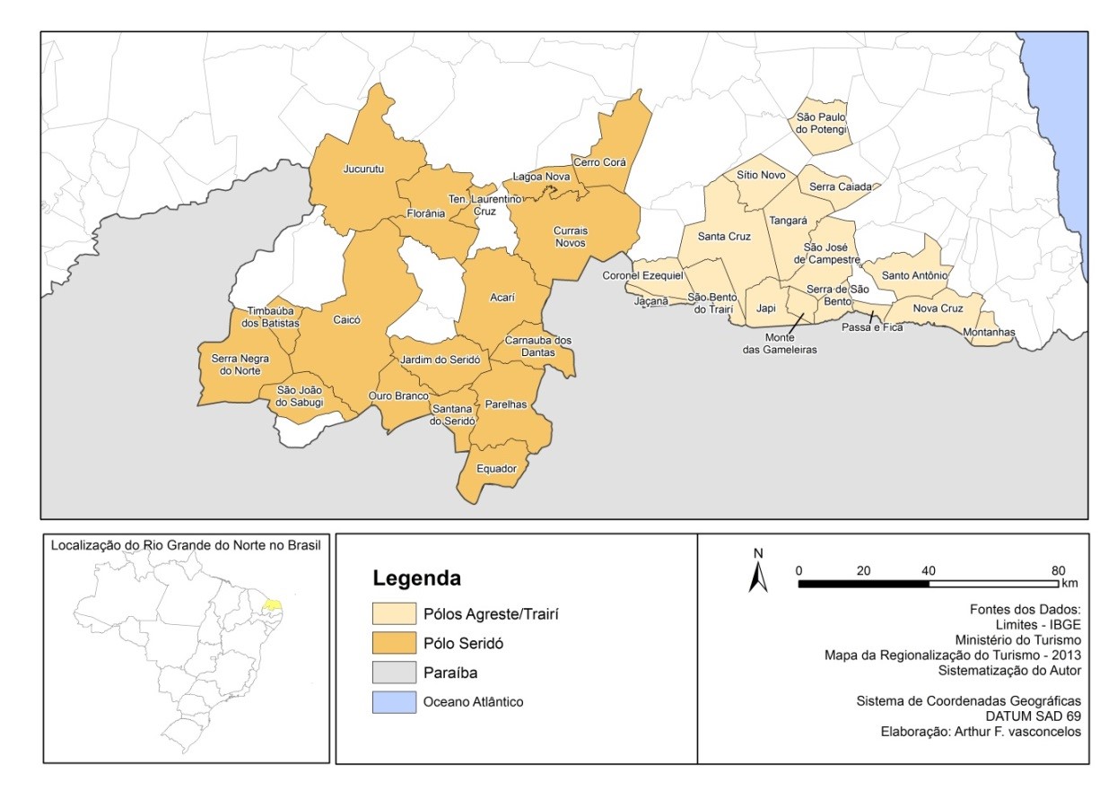 No Rio Grande do Norte foram identificadas, inicialmente, cinco regiões turísticas[3], a saber: Polo Costa das Dunas; Polo Costa Branca; Polo Agreste-Trairi; Polo Seridó e Polo Serrano (Figura 1). Na regionalização de 2013, o último polo foi extinto, de modo que atualmente existem quatro polos turísticos: 2 (dois) litorâneos e 2 (dois) interioranos. Apesar da criação de tais regiões turísticas, o turismo no interior do estado ainda é limitado e apresenta muitas dificuldades, de modo que essa atividade continua concentrada no litoral, especialmente no Polo Costa das Dunas.