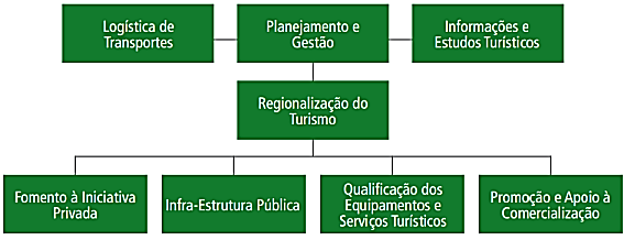 Analisando a política nacional, verifica-se que tal programa exerce a função de articulador, interligando os macroprogramas iniciais de planejamento da atividade aos que de fato vão propiciar as condições básicas para a instalação da atividade turística. A seguir, pode-se visualizar um organograma que demonstra essa reflexão (Figura 3).