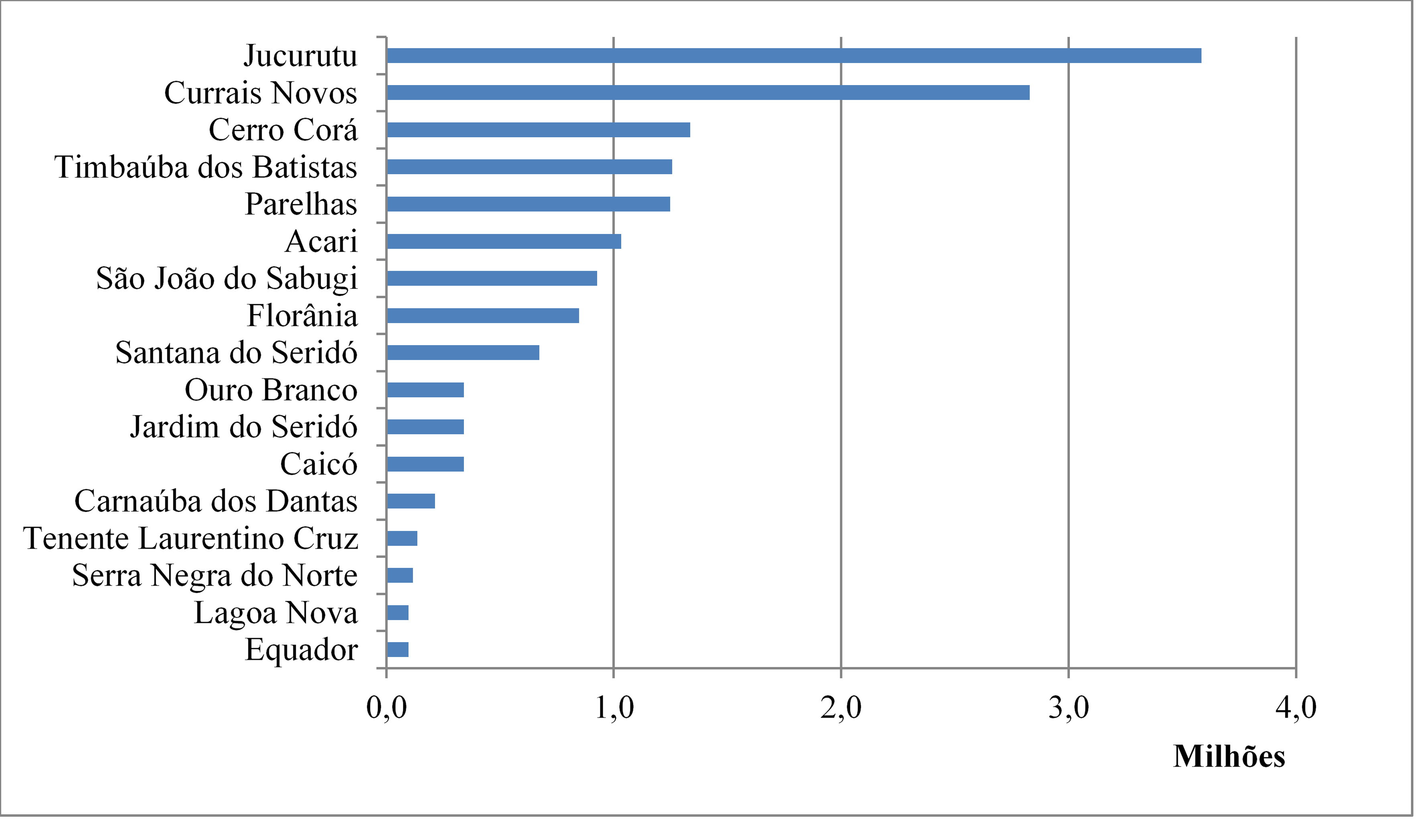 Fonte: Mtur. Organização dos autoresÉ notável a concentração de investimentos em determinados municípios em ambas as regiões estudadas. No Polo Seridó, os municípios de Jucurutu e Currais Novos foram privilegiados na obtenção de recursos, englobando 41,58% do total para o período enfocado. Somando os valores recebidos por esses dois municípios aos recursos obtidos por Cerro Corá, Timbaúba dos Batistas, Parelhas e Acari, temos um total de R$ 11.286.450,00 o que equivale a 73,19% do total global, enquanto municípios como Equador e Lagoa Nova receberam 0,6% dos recursos cada um, ou seja, é perceptível a seletividade espacial na dotação desses recursos (Figura 4).