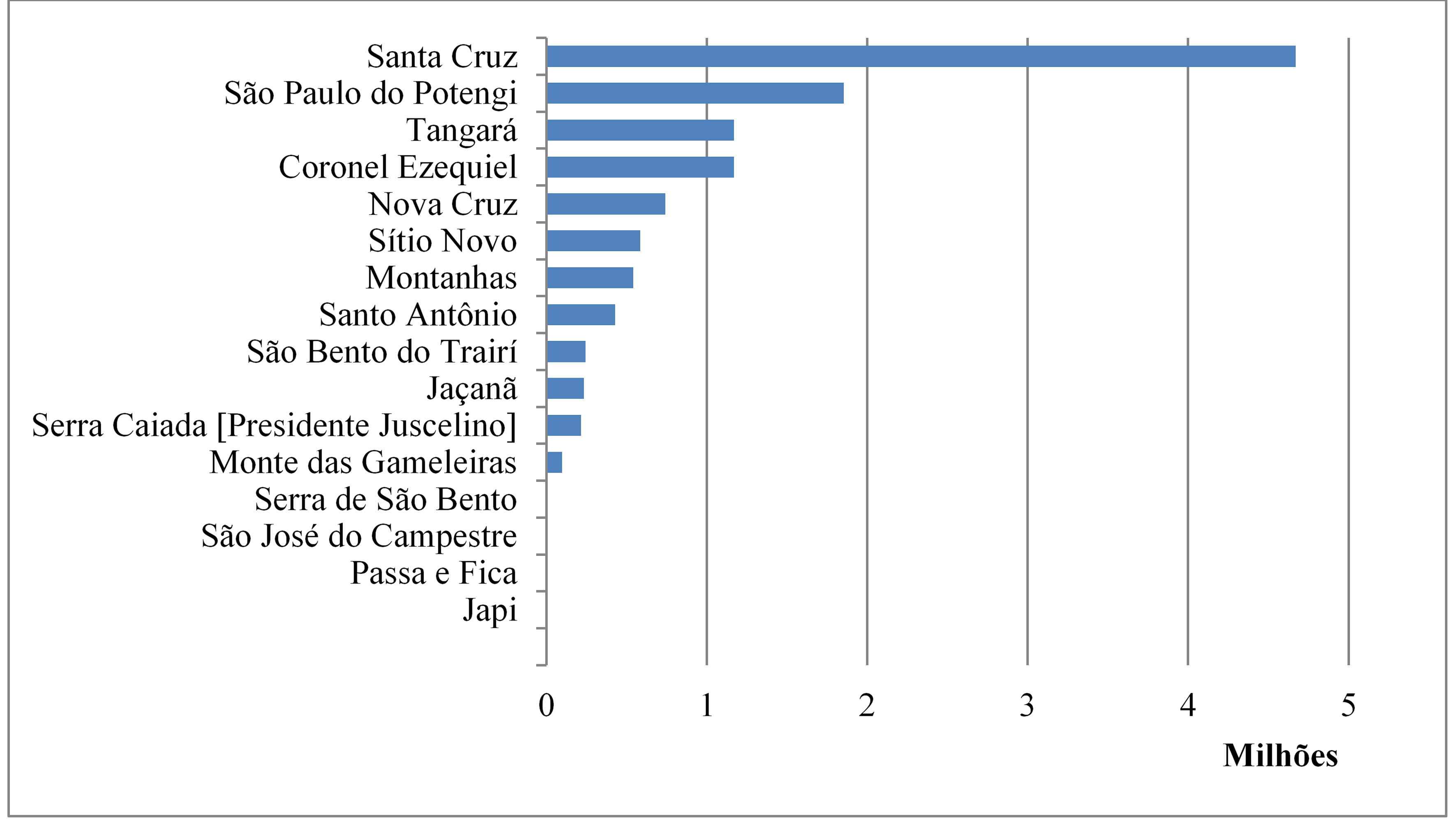 No Ptat, a concentração na distribuição dos recursos fica mais evidente em Santa Cruz (Figura 5). São Paulo do Potengi obteve o segundo maior investimento desde a criação da região turística, seguido de Tangará que também não participou de forma efetiva do conselho de turismo organizado pelo PRT.