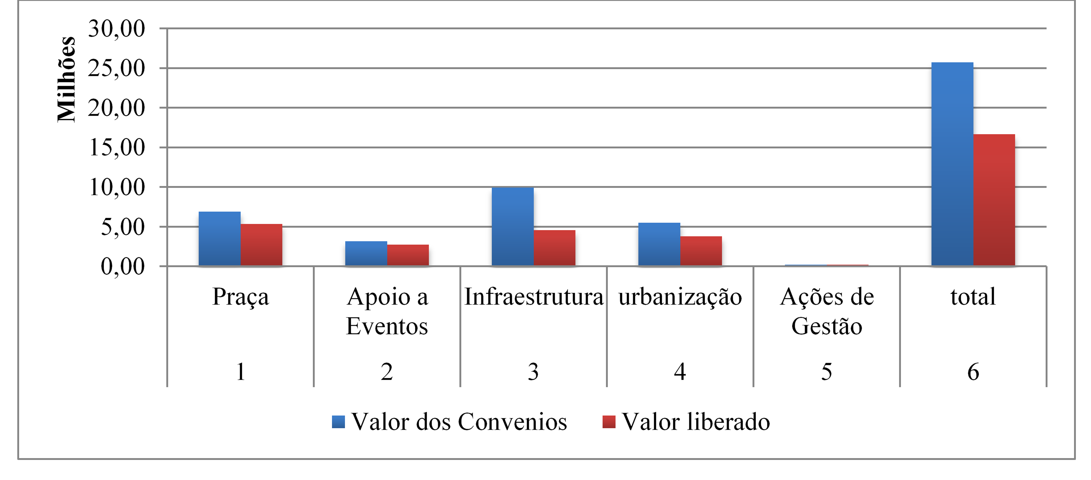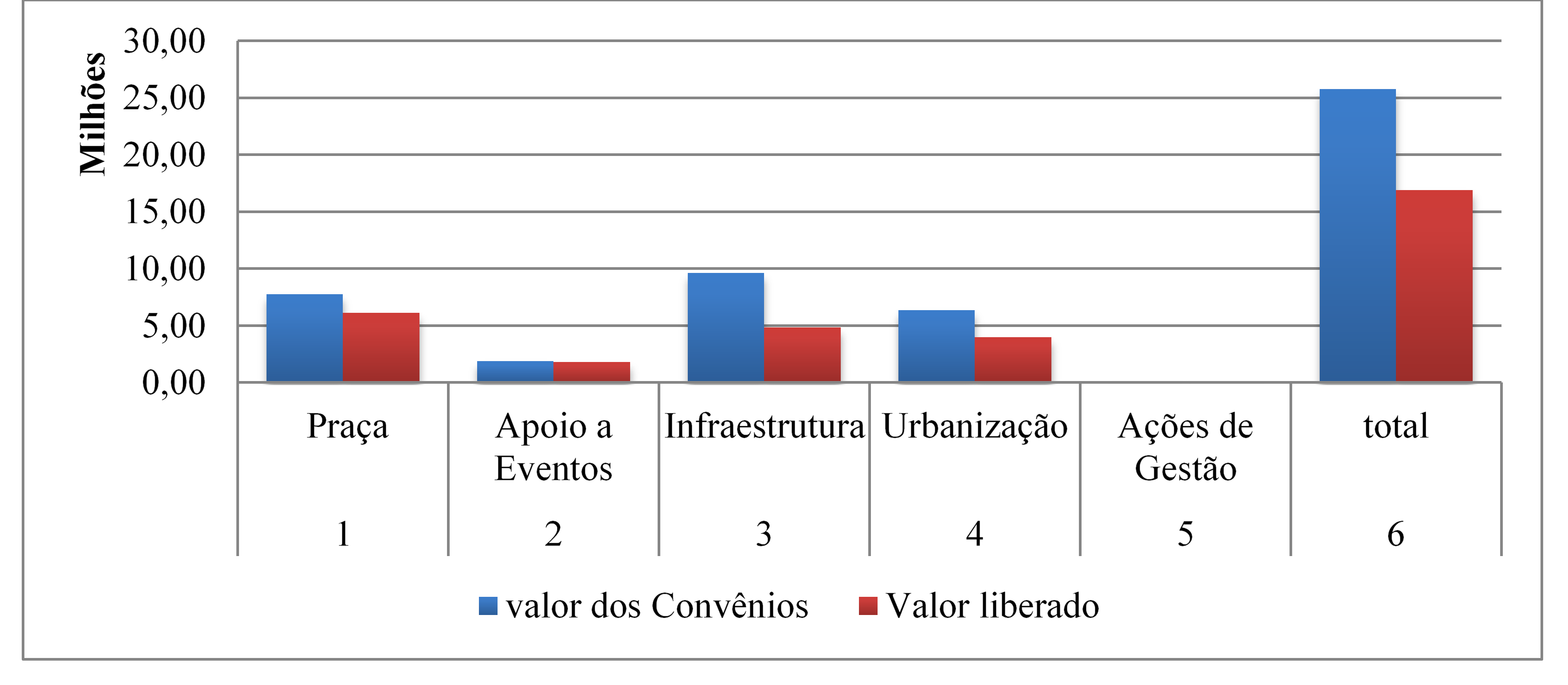 1 - Construção de praças públicas; 2 - Apoio a eventos; 3 - Infraestrutura (ginásios, centros esportivos e culturais); 4 - Urbanização (urbanização de vias, construção de pórticos e canteiros de ruas); 5 - Ações de gestão (apoio a projetos de desenvolvimento do turismo e mecanismos de gestão).