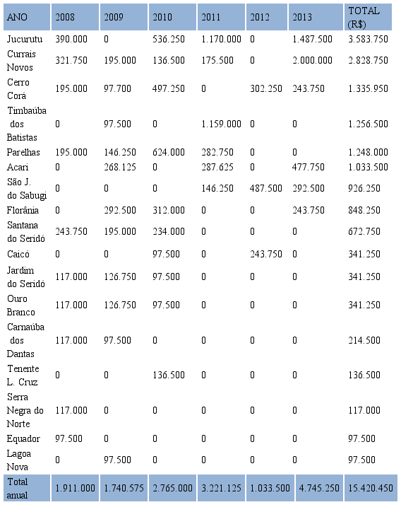 Observando os dados da Figura 4, fica evidente a discrepante distribuição dos recursos, por município. Jucurutu (PTS) é o caso mais conflitante desse levantamento, uma vez que recebe os maiores quantitativos de investimentos, chegando a acumular mais de 3,5 milhões de reais no período analisado. No entanto, é importante observar que, considerando o levantamento feito para a pesquisa, nas atas do conselho, Jucurutu só participou de uma reunião em 2010 e seus indicadores econômicos e mercado de turismo não apontam aspectos relevantes que justifiquem um maior montante de investimentos (SILVA, 2015).