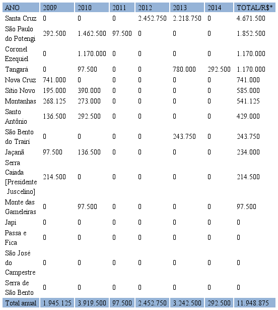 Identifica-se uma correlação entre os indicadores econômicos e políticos e o montante de recursos liberados pelo MTur, mas isso não se constitui regra geral, na medida em que há municípios com maior expressão e que não foram contemplados com recursos de forma significativa (Caicó), enquanto outros com pouca expressão foram contemplados (Timbaúba dos Batistas e Coronel Ezequiel). De modo geral, verifica-se que foi alocado menor volume de recursos justamente nos municípios com menor população, e com economia pouco diversificada, com pouca expressão política, tendo inclusive alguns pequenos municípios das regiões turísticas que não foram contemplados com recursos.