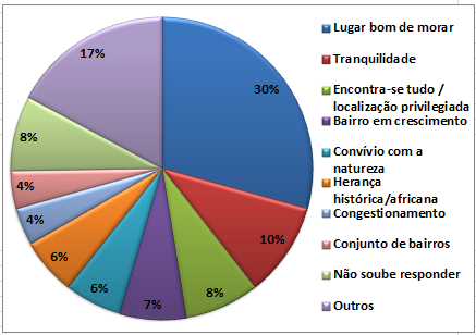 A primeira pergunta buscou entender a percepção dos moradores sobre o bairro a partir da memória afetiva dos entrevistados. Então, questionou-se o que o nome “Cabula” lhes evocava. As respostas mais representativas quantitativamente aludiam à ideia de um “Lugar bom de se morar” (30%). Essa resposta foi justificada, segundo eles, pela “Tranquilidade” (10%), “Localização privilegiada” (8%), por ser um “Bairro em crescimento” (7%), “Convívio com a natureza” e “Herança africana” (6%), conforme a Figura 2.