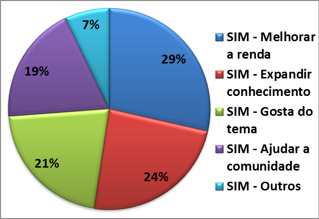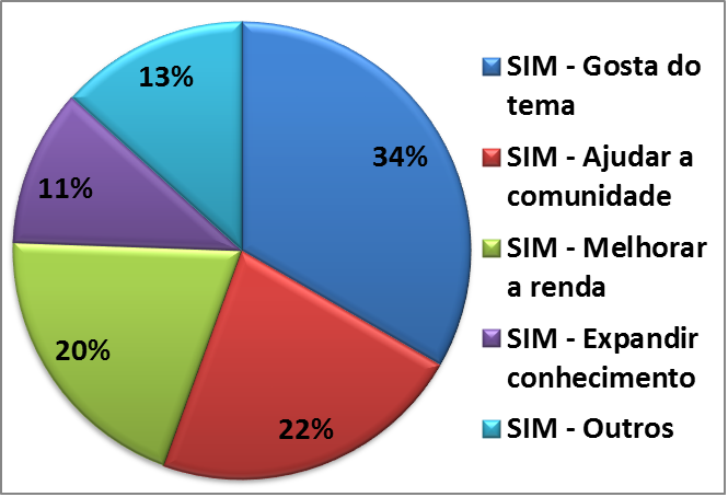 Por outro lado, 57% dos entrevistados afirmaram que “Gostariam de trabalhar com o patrimônio cultural de origem africana disponível no bairro”. Os motivos para tal interesse são variados: “Gostam do tema” (34%), “Querem ajudar a comunidade” (22%), “Desejam melhorar a renda” (20%), “Expandir o conhecimento” (11%) entre outros (ver Figura 3).