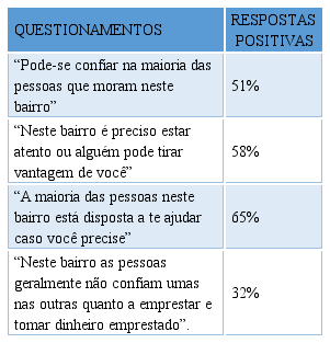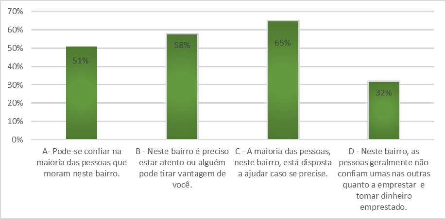 Dando prosseguimento, buscou-se identificar quais os níveis de confiança que os moradores nutriam em relação a seus vizinhos. Para tal, eles precisavam dizer se “concordavam” ou “não concordavam” com as afirmações abaixo, sendo as respostas, majoritariamente, positivas, conforme a Tabela 01.