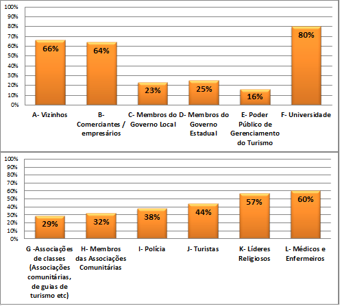 Acredita-se que por ser um bairro que não convive com o turismo, o “Órgão Público de Gerenciamento do Turismo” representa uma entidade distante da realidade dos moradores e por isso não desfruta do conhecimento/confiança dos entrevistados. Já os 32% referentes aos “Membros das associações comunitárias” apresentam-se como um alerta. Isso porque essas associações comunitárias, apesar de representarem a comunidade, apresentam índices de confiança mais baixos que as instituições privadas.