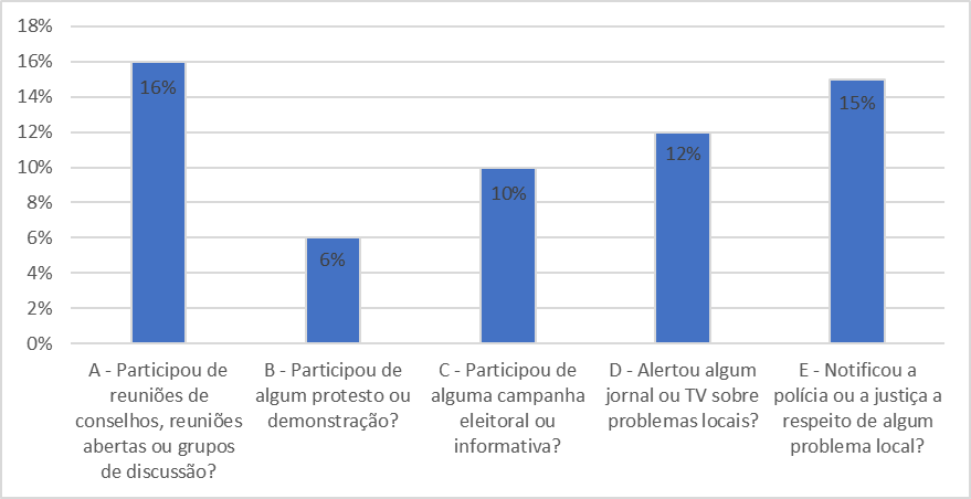 Percebe-se que apesar da demonstração de altos níveis de confiança entre si, os moradores não a exercitam através de uma prática comum. Essa informação, provavelmente, justifique o fato de que apenas 16% dos entrevistados tenham participado de alguma reunião de conselho, reunião aberta ou grupo de discussão; 6% de algum tipo de protesto e 10% de uma campanha eleitoral ou informativa. Apenas 12% desse público alegou ter alertado algum meio de comunicação sobre um problema local, enquanto 15% notificaram a polícia ou a justiça sobre alguma questão da comunidade.