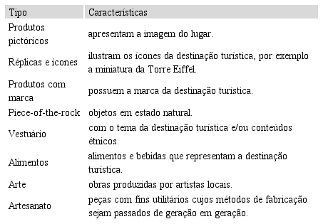 Segundo Gordon (1986), existem os seguintes tipos de souvenir, conforme Quadro 1: