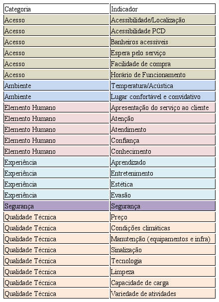 A categoria experiência avalia questões como o nível de aprendizado, diversão e evasão que o turista teve ao visitar certo atrativo. Ela é composta pelos seguintes indicadores: aprendizado no evento; diversão no evento; beleza e estética do evento; e nível de fuga de rotina diária.