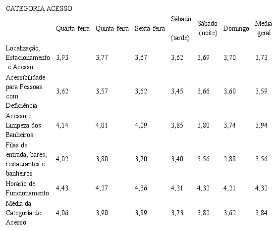 Com relação à categoria de acesso, verificou-se que obteve a pior média, juntamente com mais duas categorias. Isso se deve ao fato pela mensuração tanto do indicador de acessibilidade para pessoas com deficiência quanto do indicador de filas de entrada, bares, restaurantes e banheiros. Além disso, mais dois indicadores não atingiram o nível bom (localização, estacionamento e acesso; acesso e limpeza dos banheiros). A compilação dos resultados é apresentada na Tabela 1.