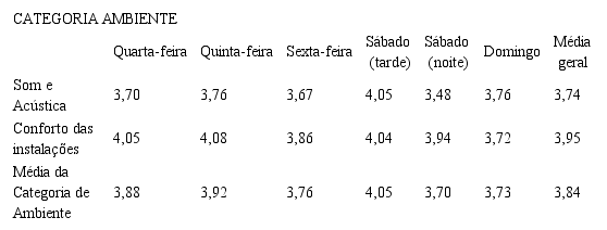 A segunda categoria analisada é a de ambiente, que leva em conta as questões de conforto, agradabilidade, temperatura e tranquilidade no atrativo. Ela é composta pelos seguintes indicadores: som e acústica, e conforto das instalações. Com relação ao som e acústica, a média dos índices de avaliação desse indicador foi de 3,74 de 5, ficando entre a avaliação mediana e boa. Analisando os dados, notou-se que esse indicador poderia ser melhorado. A principal reclamação dos visitantes foi que o som estava muito alto. O palco estava localizado no centro da praça de alimentação. A maioria que estava nas mesas sentadas relatou que o volume estava elevado e não tinha como conversar. Maciel (2015), ao pesquisar a qualidade do Carnaval do Rio, identificou que a sonorização apresentou inúmeras falhas.
