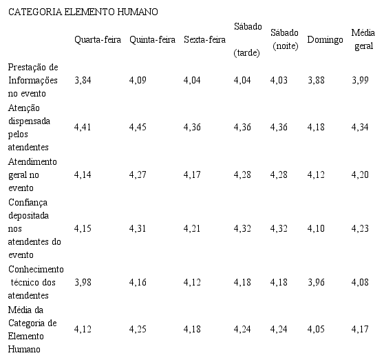 Com relação à categoria de elemento humano, verificou-se que obteve a melhor média comparada com todas as outras categorias. Isso se deve ao fato pela mensuração tanto do indicador de atenção dispensada pelos atendentes, atendimento geral no evento e confiança depositada nos atendentes do evento, na qual foi acima do esperado. Além disso, mais um indicador atingiu o nível bom (Conhecimento técnico dos atendentes). O único indicador que teve a média abaixo do nível bom foi a de prestação de informações no evento. A compilação dos resultados é apresentada na Tabela 3.