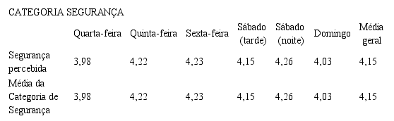 Com relação à categoria segurança, verificou-se que obteve a segunda melhor média comparada com todas as outras categorias. Analisando essa categoria, que possui apenas um indicador, observa-se que ela teve uma nota boa. A compilação dos resultados é apresentada na Tabela 5.