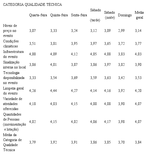 Com relação à categoria qualidade técnica, verificou-se que obteve a pior média, com mais duas categorias, comparada com todas as outras categorias. Isso se deve ao fato da mensuração tanto do indicador de nível de preço no evento, condições climáticas e tecnologia disponibilizada no evento, na qual ficou abaixo da média da categoria. Os indicadores que tiveram a média acima do nível bom foram a de infraestrutura do evento, limpeza geral do evento, variedade de atividades oferecidas e quantidade de pessoas (movimentação e lotação). A compilação dos resultados é apresentada na Tabela 6.