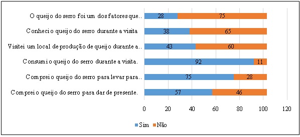 Durante a visita, 89% dos visitantes mencionaram ter consumido o queijo. Mesmo que a maioria tenha consumido o queijo, boa parte (58,2%) não visitou o seu local de produção. Não se pode afirmar qual a razão da não visitação, mas talvez se refira à ausência de oferta estruturada do serviço ou de divulgação dessa oferta, visto que 85 dos 103 respondentes mencionaram possuir interesse em realizar tal atividade (Figura 2). Com relação ao consumo pós-visita, nota-se que 72% dos visitantes levaram o queijo para consumir em casa e 55,3% para dar de presente. Assim, o QMA do Serro foi adquirido como souvenir gastronômico segundo o conceito de Horodyski, et al (2014).