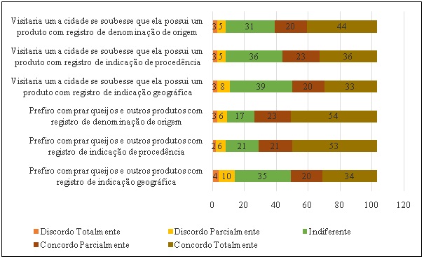 Além disso, os respondentes mostraram-se mais inclinados à compra de produtos com registro de IP e DO do que a visitar cidades que os produzem. Ainda assim a soma dos respondentes que concordam total ou parcialmente com as afirmações supera mais da metade das respostas válidas em todos os casos. Assim, pode-se avaliar a atitude dos visitantes como favorável ante a compra do queijo com registro de indicação geográfica e a visitação de locais que possuem produtos com registro de IG.