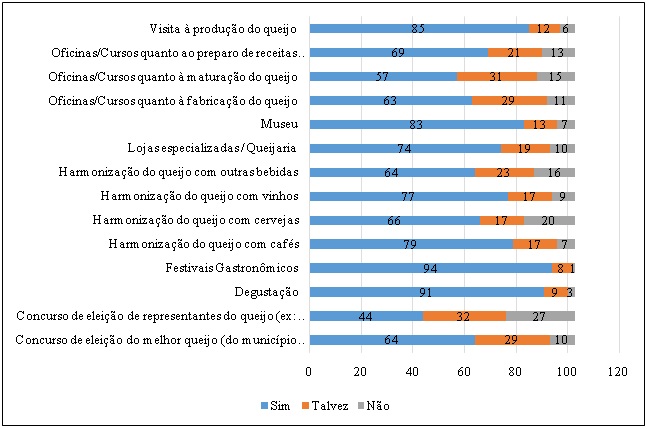 Ainda que, na maioria dos casos, não tenha havido visitação aos locais de produção, os visitantes possuem interesse em tal atividade: 82% (85 respondentes) gostariam de visitar a produção do queijo e outros 11,65% talvez visitassem caso a atividade lhe fosse ofertada. Há interesse também em outras atividades relacionadas ao queijo, pois mais de 50% dos respondentes mencionaram interesse em todas as atividades listadas (Figura 2) exceto “concurso de eleição de representantes do queijo (ex.: rainha, embaixador, etc.)”. Entretanto, nessa questão, somando as respostas positivas e as “talvez”, o percentual fica acima de 70%. Com relação às demais atividades, destacam-se as afirmativas com percentual de respondentes mais expressivos: festivais gastronômicos (91,2%); degustação de queijo (88,3%); museu temático (80,5%); harmonização do queijo com cafés (76,7%); harmonização do queijo com vinhos (74,7%); lojas especializadas/queijarias (71,9%).