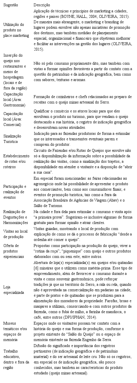 Com base nas entrevistas realizadas foram compiladas sugestões que poderiam favorecer o turismo relacionado ao queijo do Serro. São elas:
