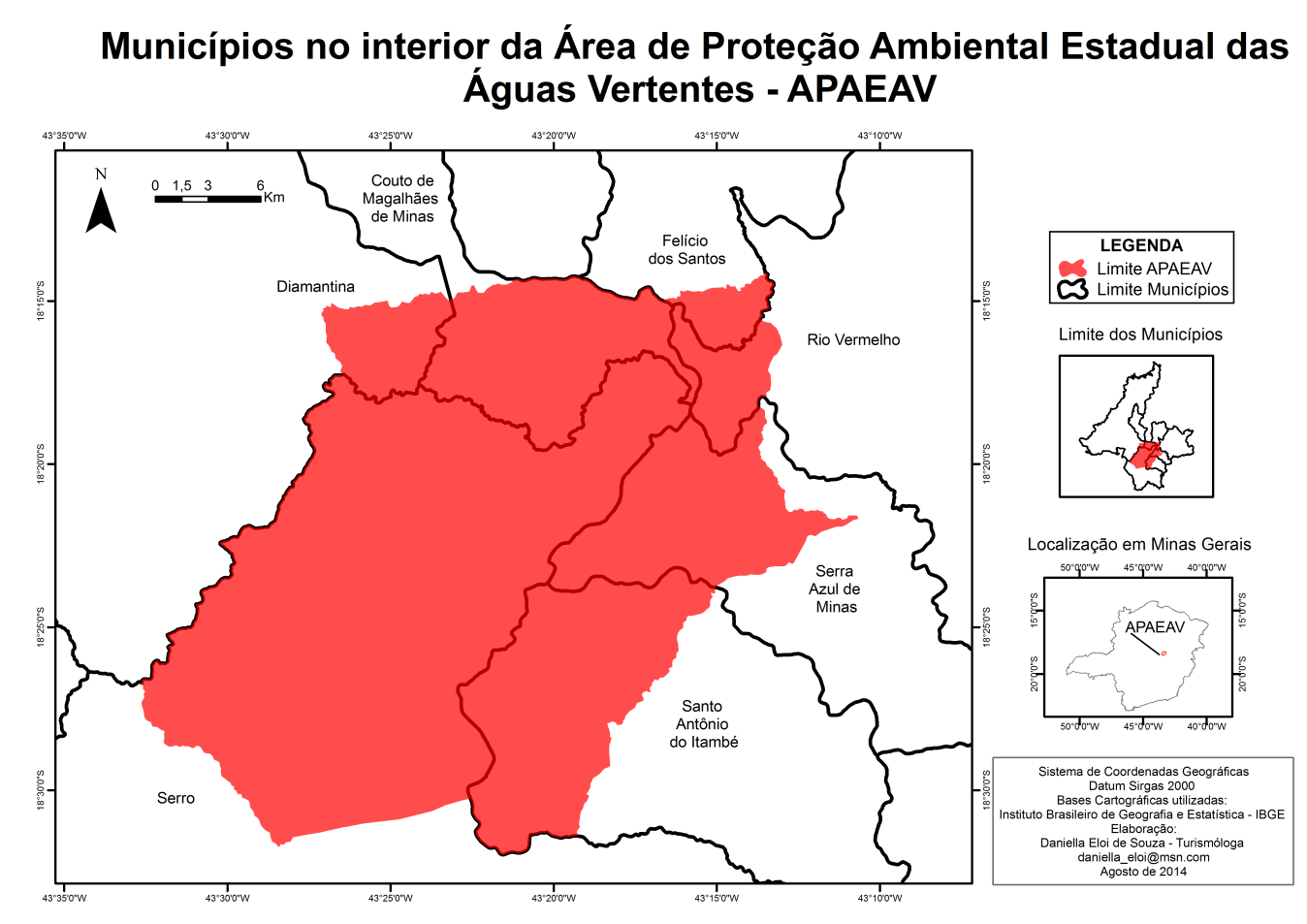 A Apaeav está localizada a 290 quilômetros de Belo Horizonte/MG, na microrregião Alto Jequitinhonha e se localiza entre as latitudes 18º 10’ S e 18º 35’ S e entre as longitudes 43º 35’ W e 43º 10’ W. Essa UC abrange parte dos municípios de Serro, Diamantina, Couto de Magalhães de Minas, Felício dos Santos, Rio Vermelho, Serra Azul de Minas e de Santo Antônio do Itambé, como pode ser visualizado no mapa da Figura 1, abaixo.