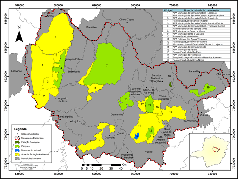 Destaca-se, ainda, que a Apaeav está inserida no Mosaico de Áreas Protegidas do Espinhaço: Alto Jequitinhonha – Serra do Cabral e que em seu interior e entorno estão localizadas outras importantes Unidades de Conservação, como o Parque Estadual do Pico do Itambé (Pepi) e o Monumento Natural Várzea do Lajeado e Serra do Raio (Monat), no interior da Apaeav; e os Parques Estaduais do Rio Preto (Perp) e do Biribiri (Pebi), que se encontram em seu entorno. Esse fato ressalta a importância ambiental da região e contribui para a existência de uma paisagem mais exuberante e preservada. A presença do Mosaico de Áreas Protegidas e das UCs próximas à Apaeav pode ser visualizada no mapa da Figura 2, abaixo.