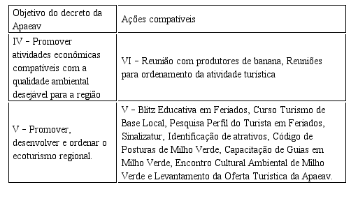 Entre os cinco objetivos específicos de criação da Apaeav, dois tem relação com a atividade turística. Analisando os Relatórios Anuais de Atividades, foram identificadas as seguintes ações compatíveis com esses objetivos, conforme Quadro 1, a seguir.
